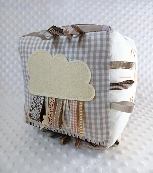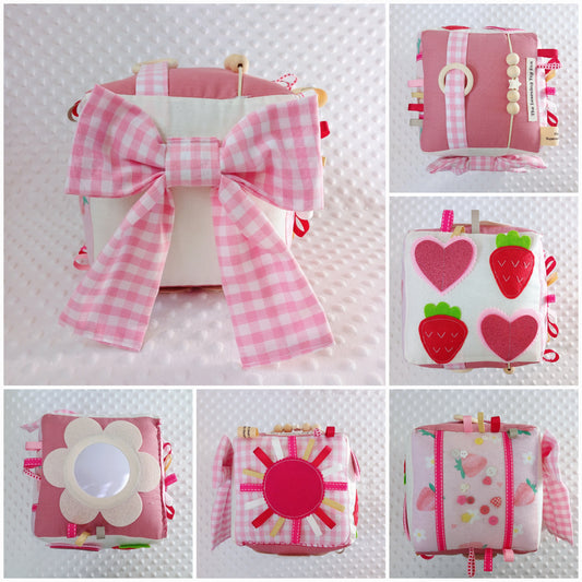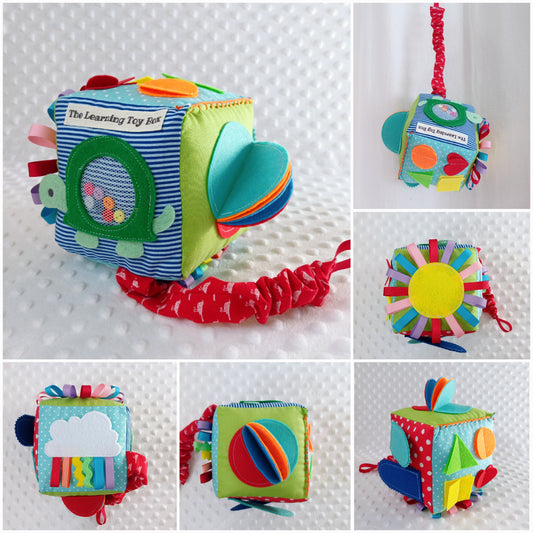 ๏ปฟAn Activity Cube is a 6 sided cube filled with age appropriate activities focusing on sensory development and fine motor skills for the ages of newborn to 2 years.